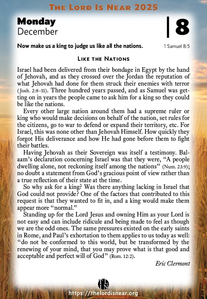 Israel had been delivered from their bondage in Egypt by the hand of Jehovah, and as they crossed over the Jordan the reputation of what Jehovah had done for them struck their enemies with terror (Josh. 2:8–11). Three hundred years passed, and as Samuel was getting on in years the people came to ask him for a king so they could be like the nations.